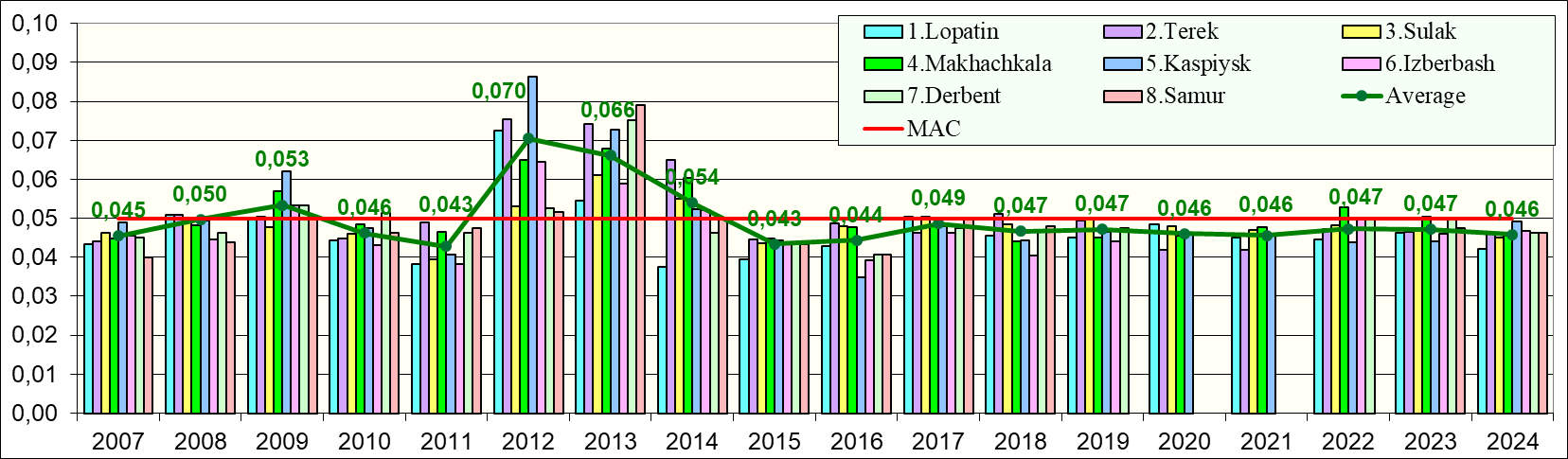 Приоритетным загрязняющим веществом в водах Дагестанского взморья в 2024г. оставались фенолы – в среднем от 2,1 ПДК у п. Лопатин до 3,5 ПДК у г. Махачкала. На протяжении периода наблюдений во всех районах средняя годовая концентрация превышали ПДК в 2-4 раза. Межгодовая изменчивость значительная, при этом многолетний тренд концентрации фенолов отсутствует.