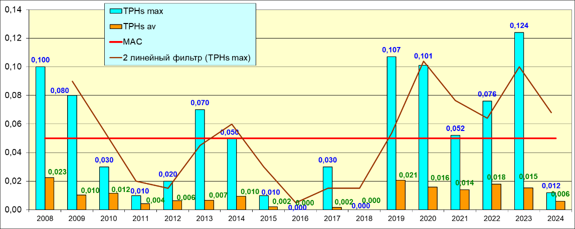 В период 1978-2000 гг. средние значения содержания нефтяных углеводородов почти постоянно достигали или превышали 1 ПДК. Начиная с 2008 г. концентрация НУ в водах Двинского залива существенно снизилась. В этот период за счет большого количества проб, в которых содержание НУ не достигало предела обнаружения используемого метода химического анализа, средняя величина обычно составляла менее половины норматива. Однако экстремальные «выбросы» в отдельных пробах достигали значений порядка 1-2,5 ПДК, максимум в 2023 г. составил 2,48 ПДК, а в 2024г. содержание НУ резко снизилось. И среднее, и максимальное значение содержания НУ стало минимальным за последние 6 лет. Тренд в период 2008-2024 гг. не выявлен.
