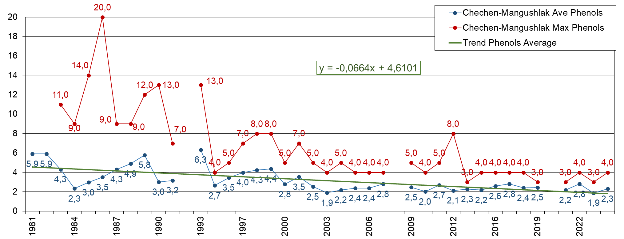 Как и ранее, среди загрязняющих веществ в 2023 г. приоритетными оставались фенолы. Анализ межгодовой изменчивости концентрации фенолов за весь период наблюдений начиная с 1981 г. указывает на наличие отрицательного линейного тренда. Основное уменьшение концентрации фенолов приходилось на 1981-2003 гг. тогда как в более поздний период ее заметного систематического изменения не наблюдалось