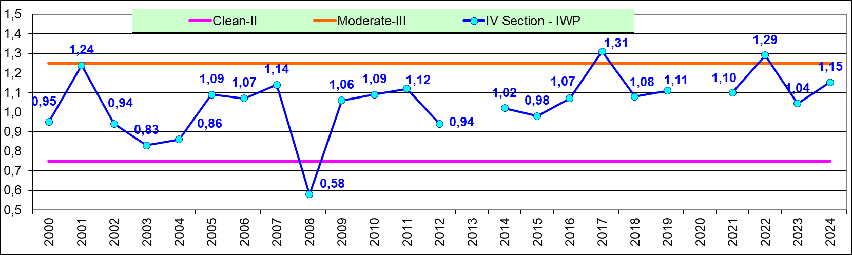 Многолетняя динамика ИЗВ за период 2000-2024 гг. свидетельствует об отсутствии какой-либо выраженной тенденции изменения качества вод в рассматриваемом районе. Практически во все годы ИЗВ находился в диапазоне значений умеренно-загрязненных вод (III класс качества). Исключение составили 2017 и 2022 гг, когда значение ИЗВ вышло за верхний предел этого класса и достигло уровня загрязненных вод. Другим исключением стал 2008 г. с нетипично низким значением ИЗВ (0,58). Скорее всего, это было связано с отсутствием в этом году наблюдений за фенолами, вносящими наибольший вклад в величину индекса в водах южной части Северного Каспия.