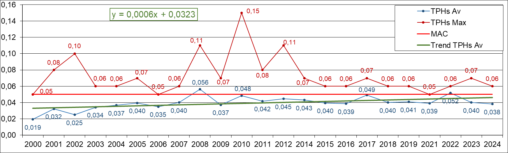Многолетняя динамика содержания нефтяных углеводородов (НУ) на границе Северного Каспия характеризовалась ростом средней годовой концентрации в 2000-2008 гг. В более поздний период среднегодовое содержание НУ в водах разреза стабилизировалось на уровне чуть менее 1 ПДК с небольшими вариациями. После 2012 г. размах максимальных годовых значений заметно уменьшился по сравнению с предыдущими годами; в 2024г. максимум составил, как и в 2018, 2019, 2022гг, 1,2 ПДК, а среднее значение менее 0,8 ПДК.