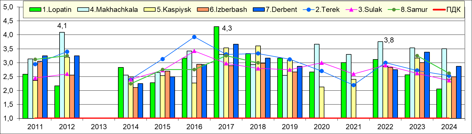 Приоритетным загрязняющим веществом в водах Дагестанского взморья в 2024г. оставались фенолы – в среднем от 2,1 ПДК у п. Лопатин до 3,5 ПДК у г. Махачкала. На протяжении периода наблюдений во всех районах средняя годовая концентрация превышали ПДК в 2-4 раза. Межгодовая изменчивость значительная, при этом многолетний тренд концентрации фенолов отсутствует.
