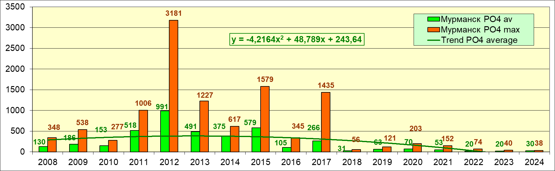 Максимальная концентрация фосфатов стала по сравнению с прошлым годом ниже почти в 2 раза, среднегодовое значение осталось на том же уровне. Сохраняется тенденция снижения содержания биогенных элементов в морской воде вблизи водпоста в торговом порту г. Мурманска.
