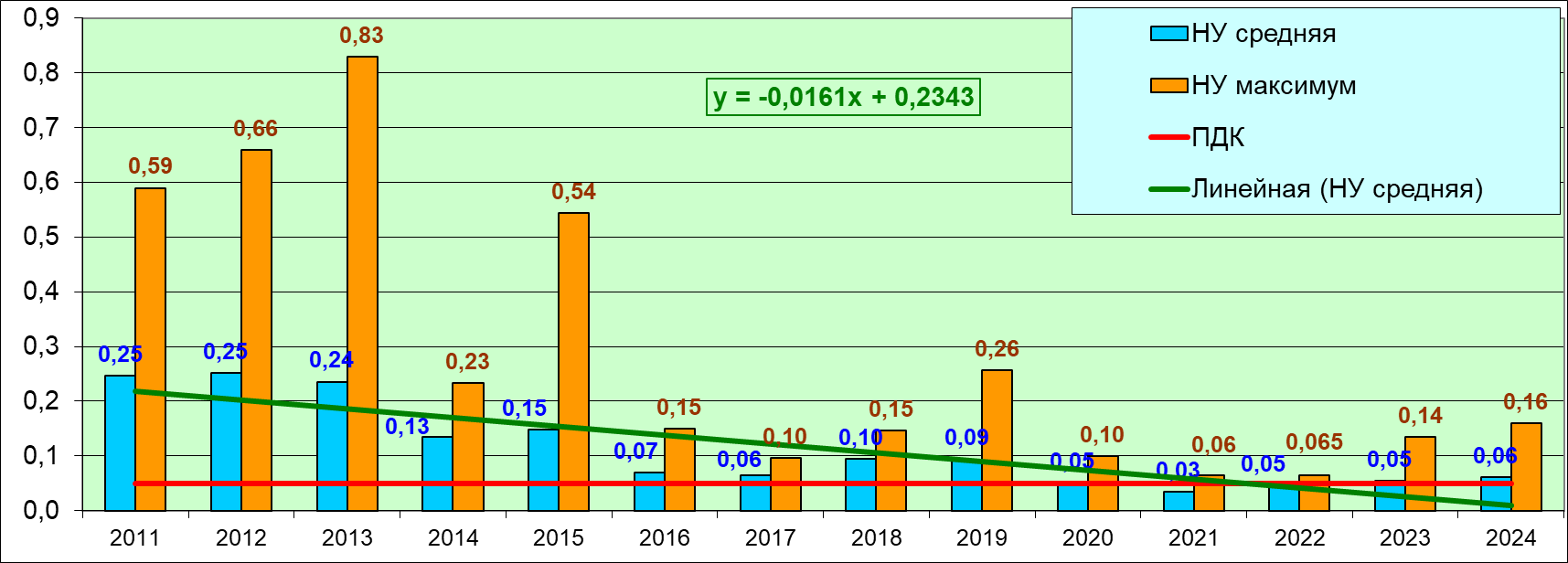 Содержание меди в 2024г., как и в 2022, 2023 г было меньше ПДК, причем не только средние, но и максимальные значения. Как видим, в 2008-2014гг содержание меди было гораздо значительней. После 2021г. значения стали существенно меньше.