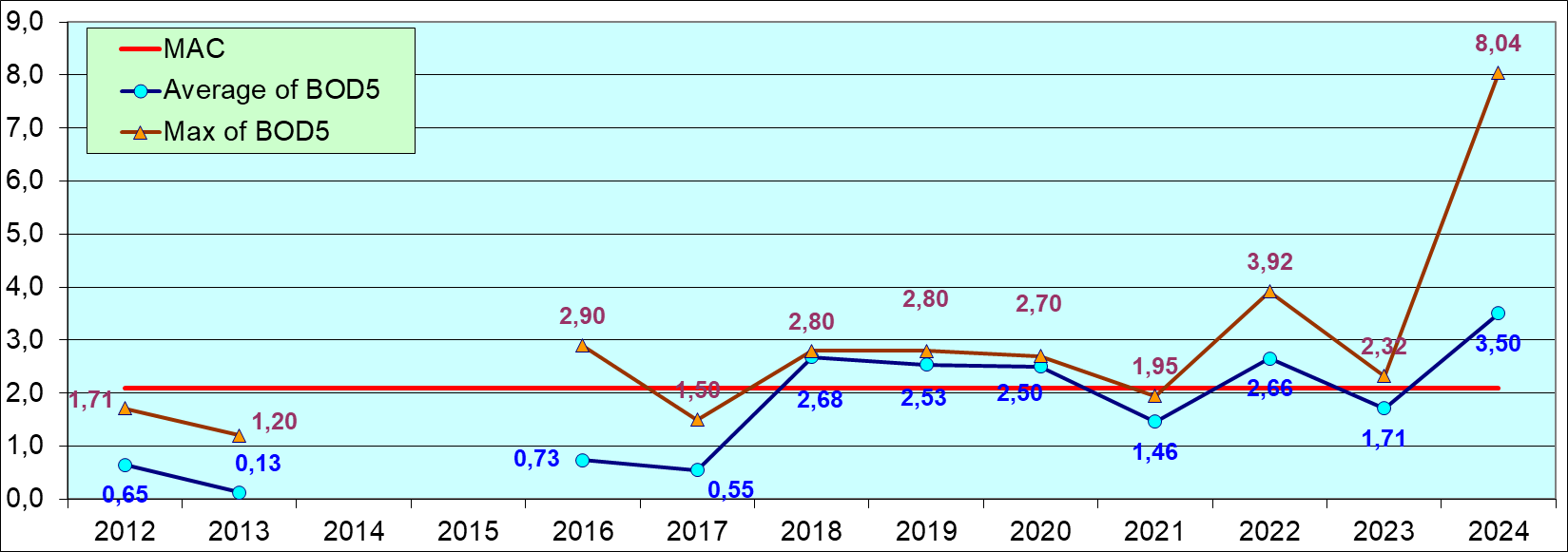 Значения биохимического потребления кислорода (БПК5) морских вод на всех станциях вблизи о. Шпицберген в большинстве случаев превышают норматив. В 2021г. и максимальное, и среднее значения БПК5 значительно снизились и стали в пределах нормы, т.е меньше 2,1 мгО2/дм3. Однако в 2024 г. БПК5 и среднее, и максимум повысились, стали намного выше нормы.