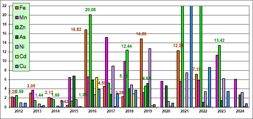 Содержание металлов в 2024г не превышает ПДК, содержание цинка после высоких значений в 2022г. значительно снизилось.